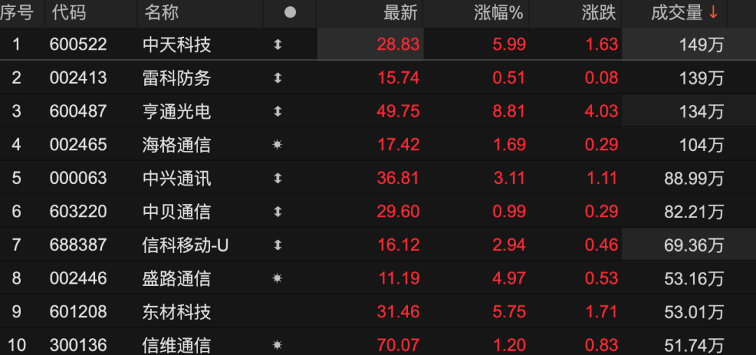 6G概念板块活跃,板块指数一度涨超3%,中天科技、雷科防务、亨通光电等多只个股涨幅靠前。资金聚焦于光通信、芯片、测试与空天地一体化等6G产业发展核心方向。