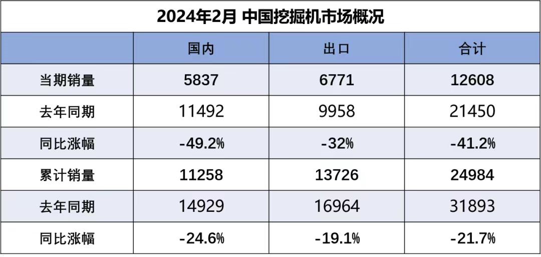 据中国工程机械工业协会对挖掘机主要制造企业统计,2024年2月销售各类挖掘机12608台,同比下降41.2%,其中国内5837台,同比下降49.2%;出口6771台,同比下降32%。